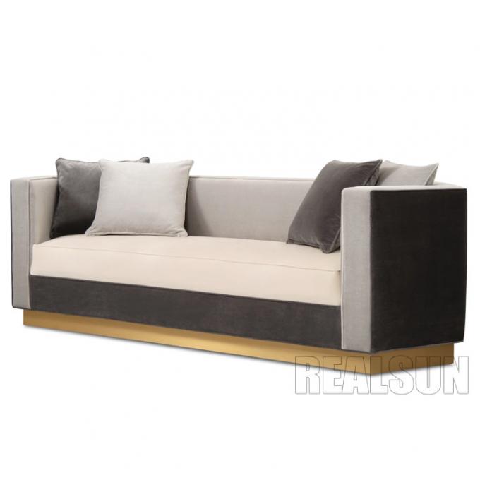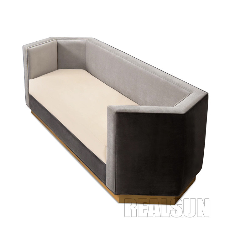 Introducing our Hexagon Sofa with a twist- color blocks of beautiful contrasting velvet. The three colors emphasize and accentuate the angular geometric shape of this unique sofa. Shown in Dark Grey, Sharkskin, and Cream velvet with a 4" brushed brass veneer toe kick.