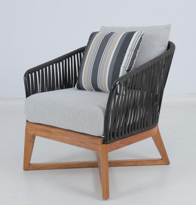 Outdoor lounge chair with angled frame wrapped with strapping, solid teak base, seat cushion, back cushion and decorative pillow. Seat cushion style: Waterfall knee edge with baseball seams. Back cushion style: Waterfall edge with baseball seam. Fabric COM
